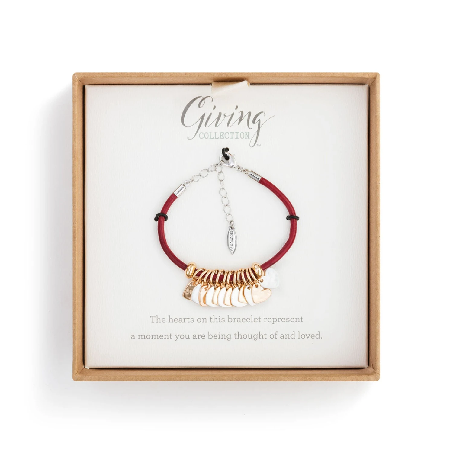 Designed to remind loved ones and friends that someone will always be in their corner, thinking of them, The Giving Collection brings warm sentiments and a unique variety of gifts for any occasion. The Charm Bracelet – Red Heart is a lovely bracelet filled with heart charms. Made from brass, metal and leather materials, this womenās accessory has an adjustable lobster clasp closure for a secure fit. Perfect for Valentineās Day, Christmas, birthdays and anniversaries, the Charm Bracelet – Red Heart will bring joy to your mom, friend, daughter, sister or co-worker. Well packaged and ready to gift, a sweet sentiment that reads, āThe hearts on this bracelet represent moments you are being thought of and loved,ā will remind them how much you truly care.