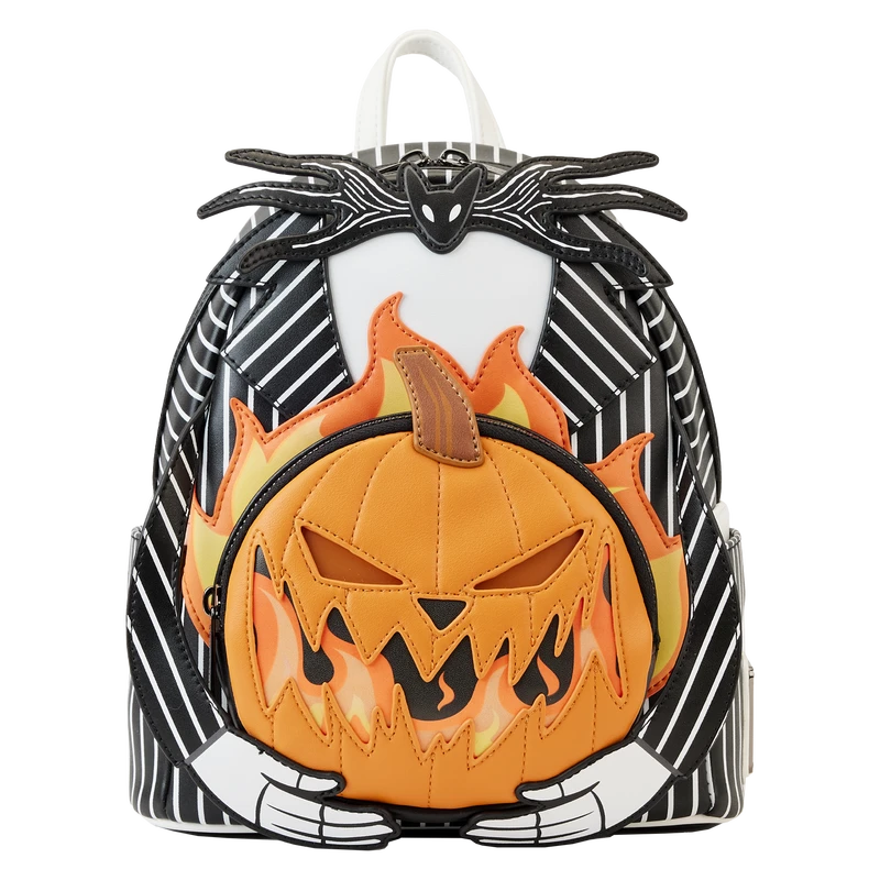 Sweep even the bravest off their feet with the Loungefly Nightmare Before Christmas Jack Pumpkin Head Mini Backpack! Taking the form of the Pumpkin King himself, the front of this accessory shows Jack Skellington as he treats the citizens of Halloween Town to a scare. A winged bat bowtie accompanies his frighteningly stylish pinstripe suit, and he holds a flaming jack-o’-lantern in his hands below. Dare to look behind the pumpkin’s wicked grin and you’ll discover a hidden zipper pocket to hold your treats. As daylight fades, the pumpkin’s flames illuminate the night with glow-in-the-dark details. A haunting addition to any outfit, this mini backpack is a scream for any fan of Disney Tim Burton’s The Nightmare Before Christmas.