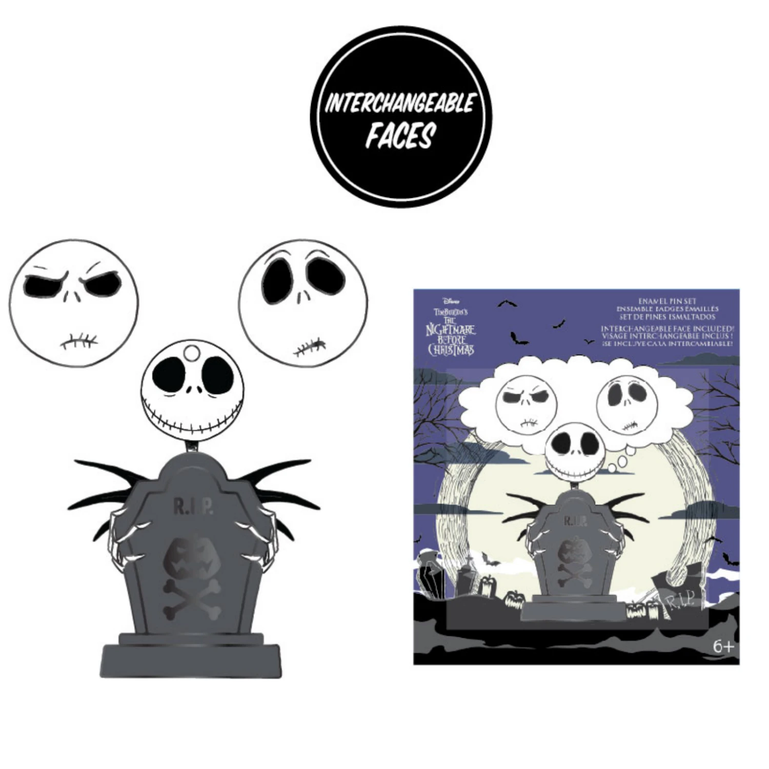 Wear this frightfully fun enamel pin featuring 3 iconic Jack Skellington expressions. It makes a hauntingly cool accessory for hats, backpacks and more.
