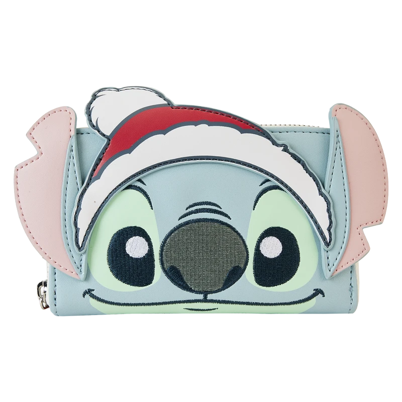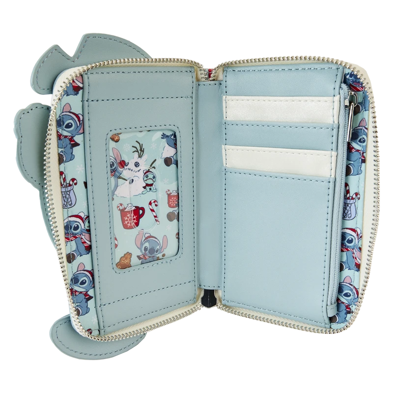 Bundle up, it’s time to play! The Loungefly Stitch Holiday Cosplay Zip Around Wallet sets the scene for winter fun. On the front, Stitch wears a festive hat while embroidered details highlight his face. The back of the wallet shows a candy cane design with shiny stripes of silver glitter. With four slots for holding cards and a clear slot for ID, this accessory will keep your essentials safe on snowy adventures with friends.