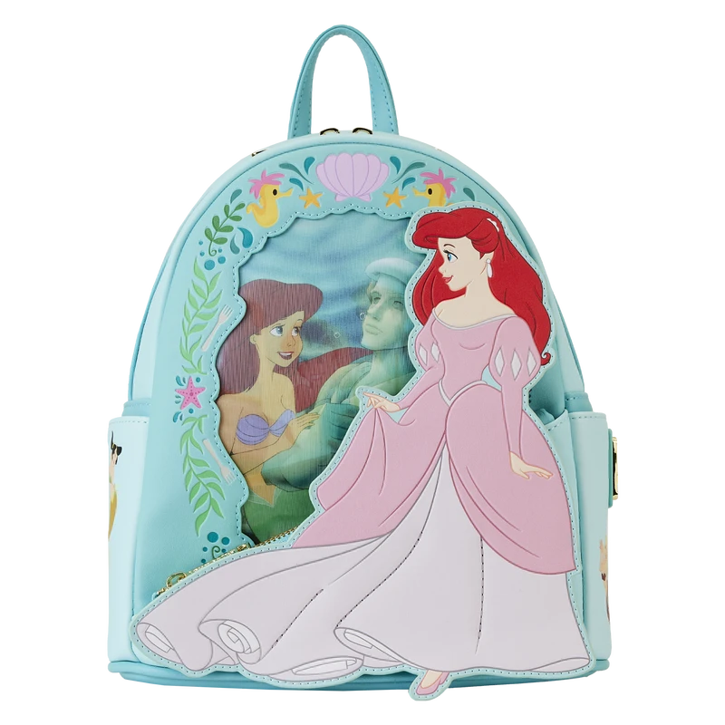 The Loungefly Disney The Little Mermaid Princess Lenticular Mini Backpack is made of vegan leather (polyurethane). Bag has adjustable shoulder straps and gold-colored metal hardware. Additional features include applique, lenticular, debossed, and printed details. Take note of the coordinating inside lining.