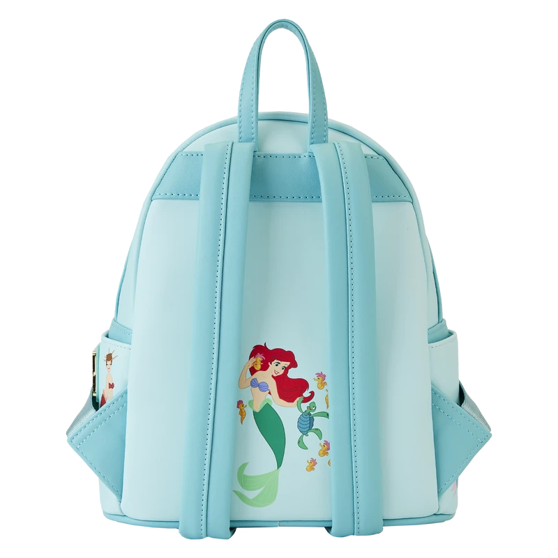 Wave hello to an ocean of adventures! Bring along our Loungefly Disney The Little Mermaid Princess Lenticular Mini Backpack. On the front, Disney’s Ariel, dressed in princess pink, looks into a die-cut applique window to see herself in mermaid form, admiring the statue of Disney’s Prince Eric under the water. In an alternate view, through lenticular details, she sees herself, and Prince Eric, living happily ever after. A diagonal zipper pocket, near Ariel’s dress, allows you to secure smaller items throughout all your journeys. Swimmingly fun details follow through on the side pockets as well. Disney’s Adella, Andrina, and Aquata appear on one side pocket, and Attina, Alana, and Arista appear on the other. Ariel makes an encore appearance on the back, along with a sea turtle and some festive sea horses. Sail away in style with this treasure of an accessory.