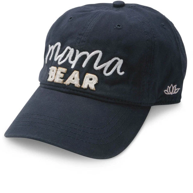 Great for gifting to a mom. “Mama Bear” text is embroidered and sewn-in with a frayed edge, as is a lotus flower icon on the side of the hat.