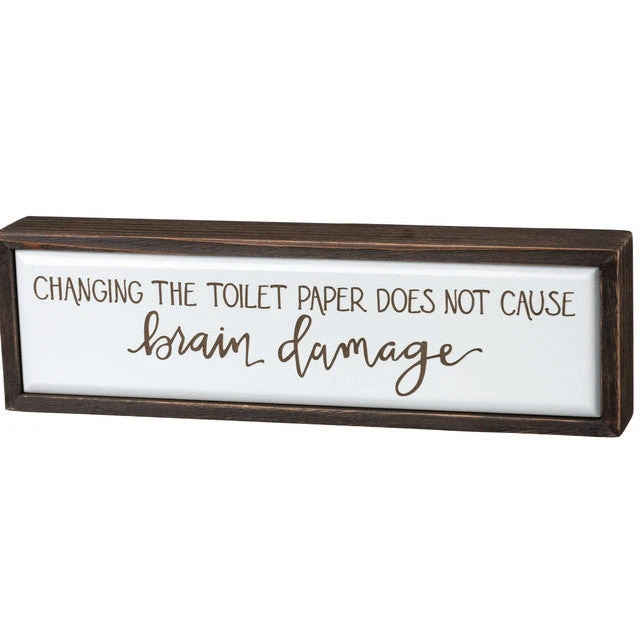 A wooden box sign featuring an engraved “Changing The Toilet Paper Does Not Cause Brain Damage” sentiment and tile-like coating. Easy to hang or can free-stand alone. Complements well with other pieces in collection.